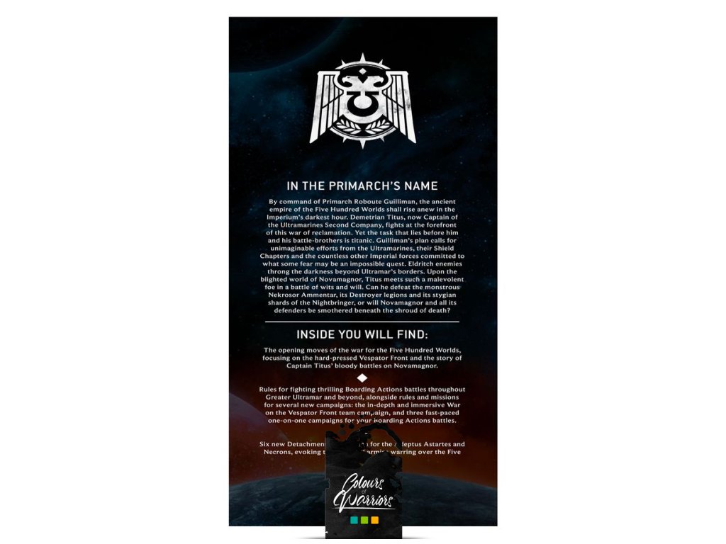 500 Worlds: Titus – 80stránková paperbacková kniha s lorem a backgroundem k úvodním krokům při znovudobytí 500 Worlds Ultramaru, včetně jednotek Ultramarines a Necronů.